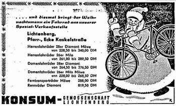 (Anzeige, neues deutschland vom 21.12.1956) Lieber Fahrradfreund, willkommen beim DDR-FahrradWiki, der Enzyklopädie für Erzeugnisse und Geschichte der Fahrradindustrie der SBZ und der DDR. Hier findest Du eine umfassende Text- und Bildersammlung mit Informationen zu Herstellern, Marken, Modellen, Ersatz- und Zubehörteilen, die Dir beim Aufarbeiten und Erhalten Deines DDR-Fahrrades von Diamant, Mifa, Möve, Simson, Brandenburg, National und vielen anderen Marken eine Hilfe sein soll. Darüber hinaus stellt das DDR-FahrradWiki umfassende Forschungsergebnisse zur ostdeutschen Fahrradgeschichte von 1945 bis 1990 zur Verfügung. Einstieg in das DDR-FahrradWiki