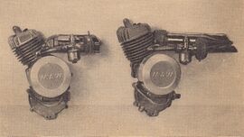 Das erste Motoren-Modell 35 FM besaß laut einer Beschreibung von 1948 eine Mehrscheiben-Lamellen-Kupplung, Zweiganggetriebe (Kurbeltrieb und Getriebe in einem Block), dreifach gelagerte Kurbelwelle, Zündlichtmaschine und Absaugkühlung.
