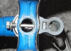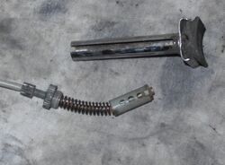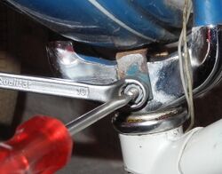Bei der Variante mit verschraubtem Ober- und Unterteil geht es nun wie folgt weiter: Soll das Schutzblech demontiert oder die Bremse vollständig demontiert werden, so schraubt man jene Mutter (Schlüsselweite 10), an der das Schutzblech am Gabelkopf fixiert ist, ab. Nun können das Schutzblech und die Halterung der Stempelbremse mitsamt des Seilzugs und Kolbens abgenommen werden. Soll nur eine Einstellung der Bremse vorgenommen werden, so löst man die SW10-Mutter lediglich etwas. Anschließend wird die Schraube mit einem kleinen Schraubendreher herausgedreht, sie ist für diesen Zweck geschlitzt. Schon nach wenigen Umdrehungen ist der Bremskolben lose und kann verstellt werden. Dazu wird die Schraube in ein anderes der drei Löcher im Kolben wieder eingedreht.
